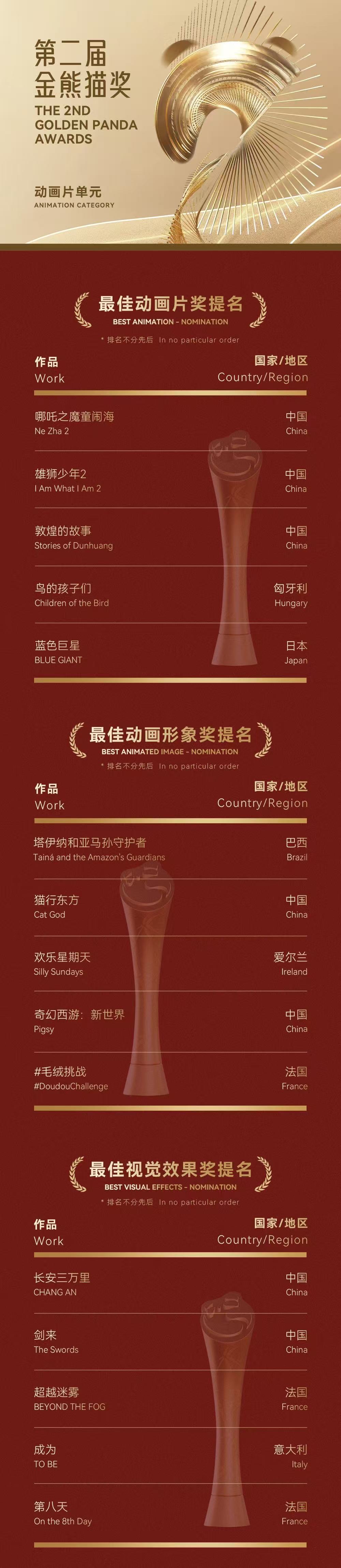 La categoría de Animación de la segunda edición de los Golden Panda Awards cuenta con tres premios principales: Mejor Animación, Mejor Imagen Animada y Mejores Efectos Visuales. Los ganadores serán anunciados en la ceremonia de entrega de premios Golden Panda el sábado por la noche.